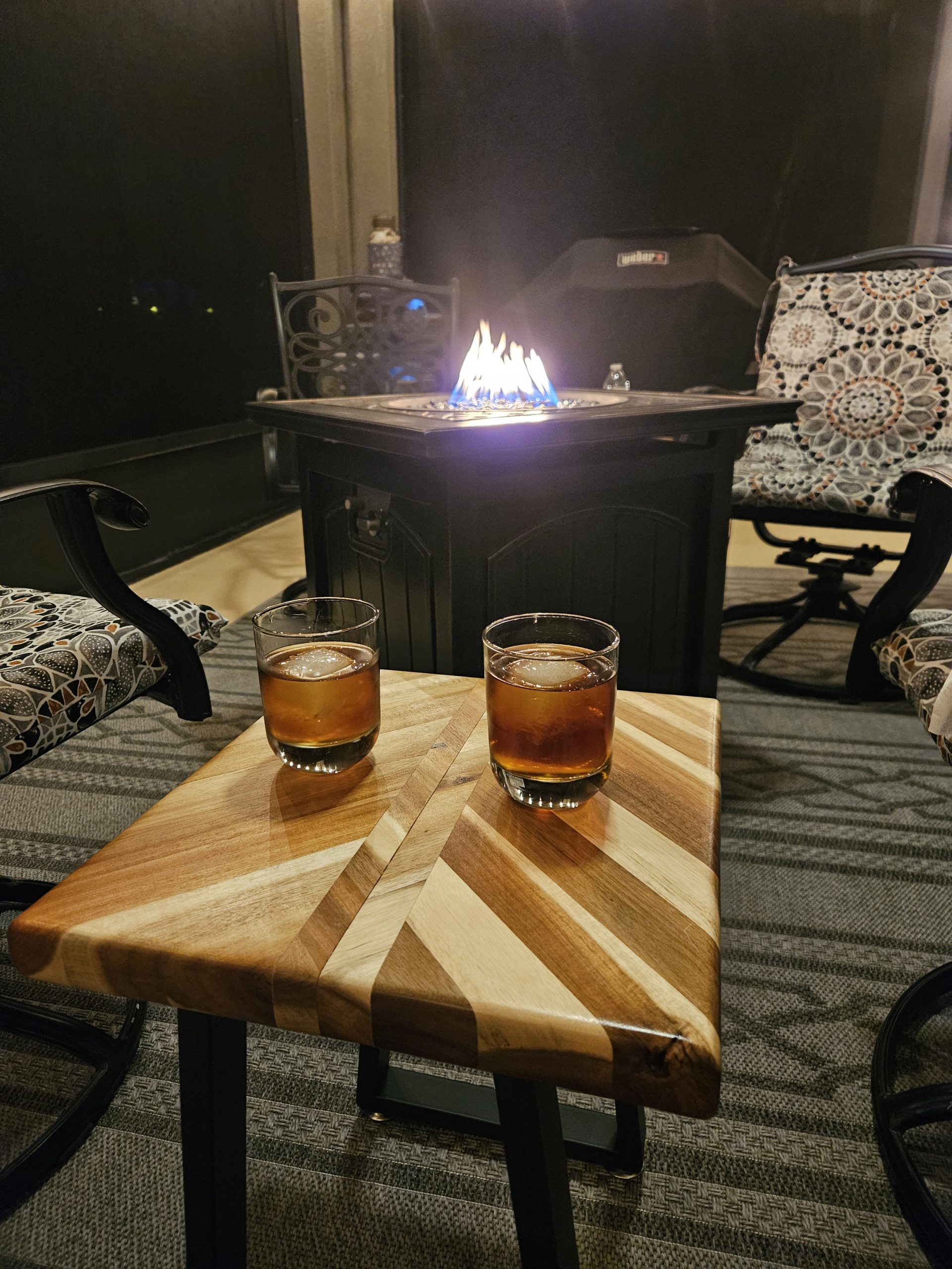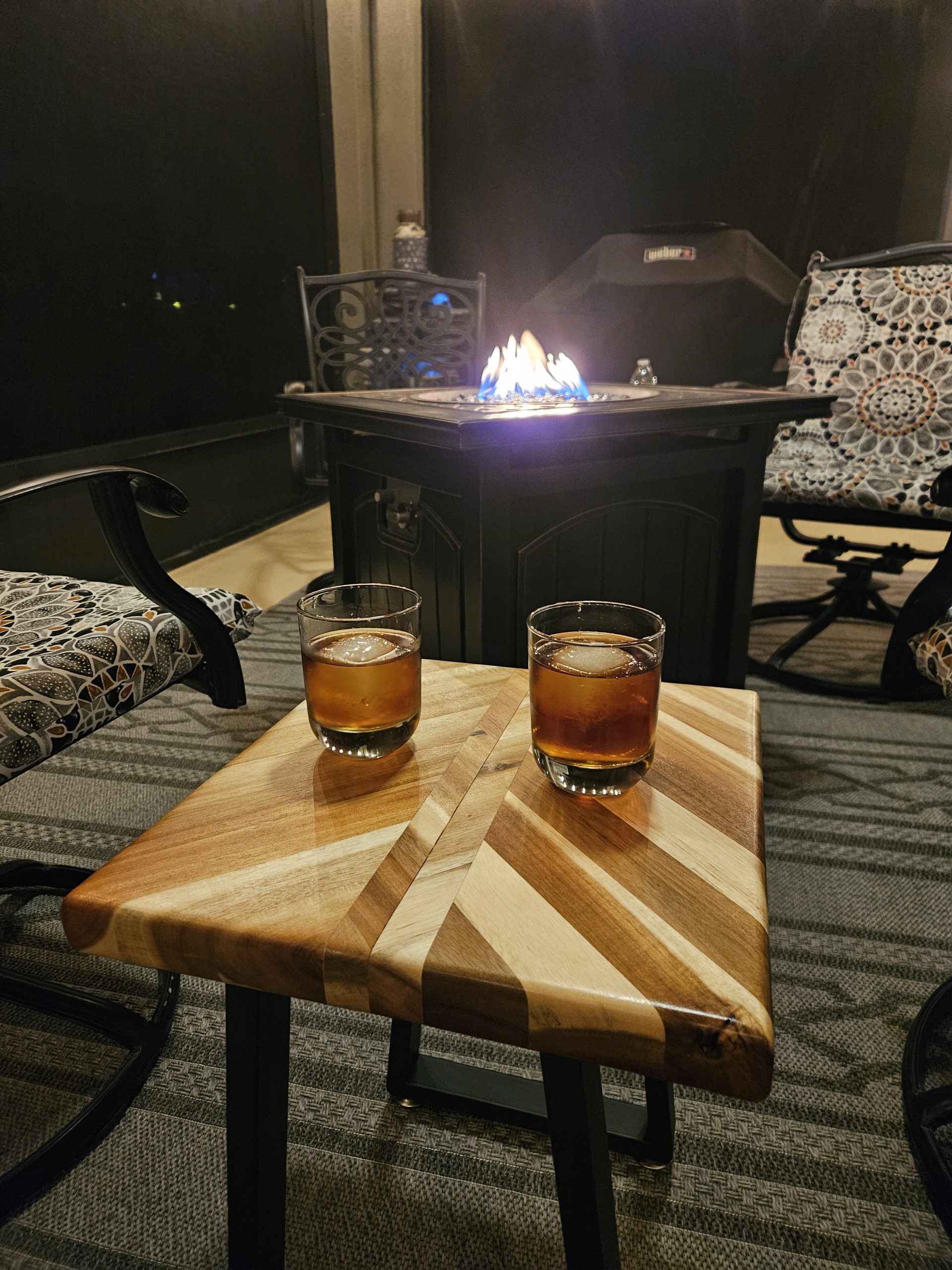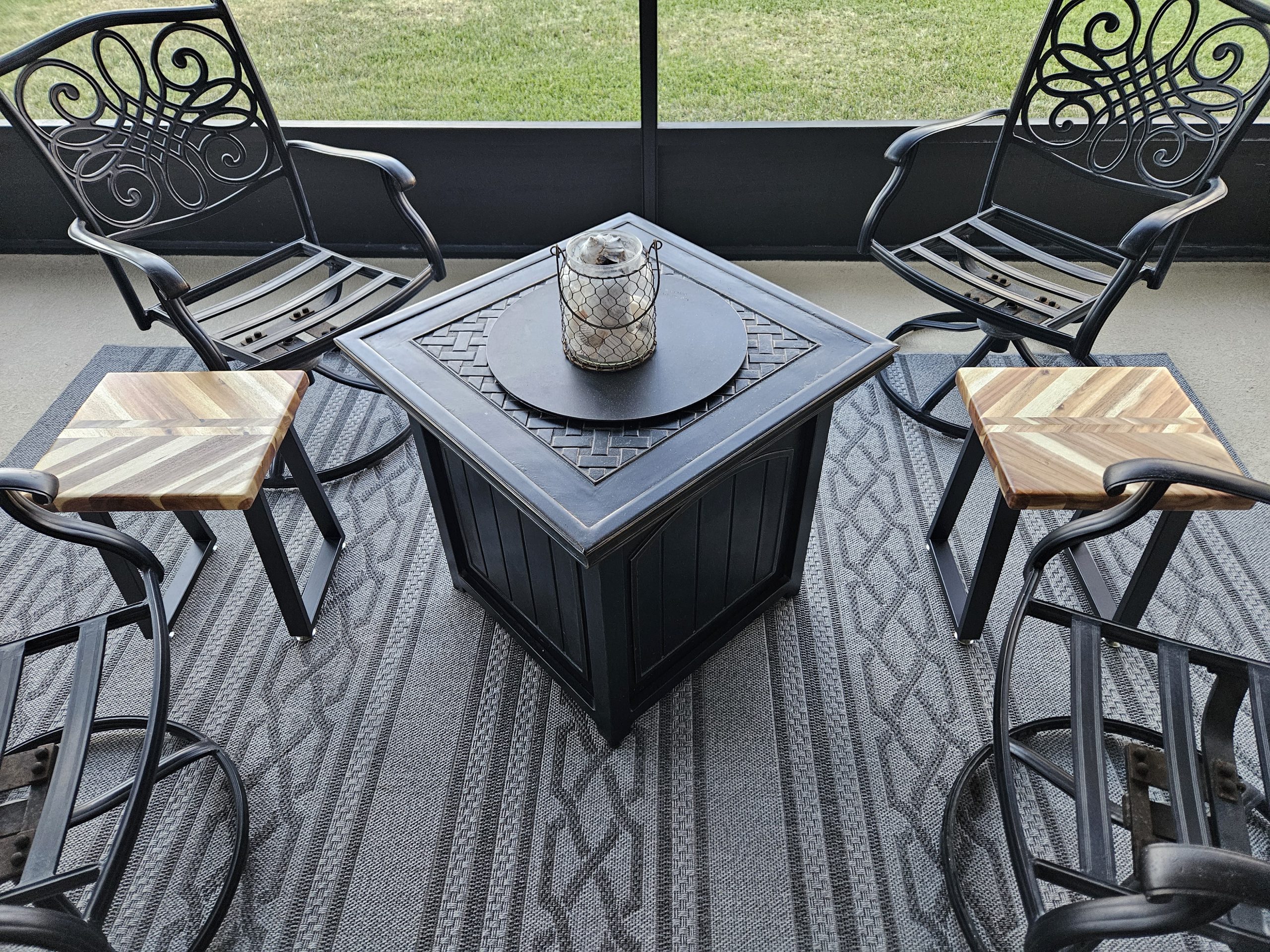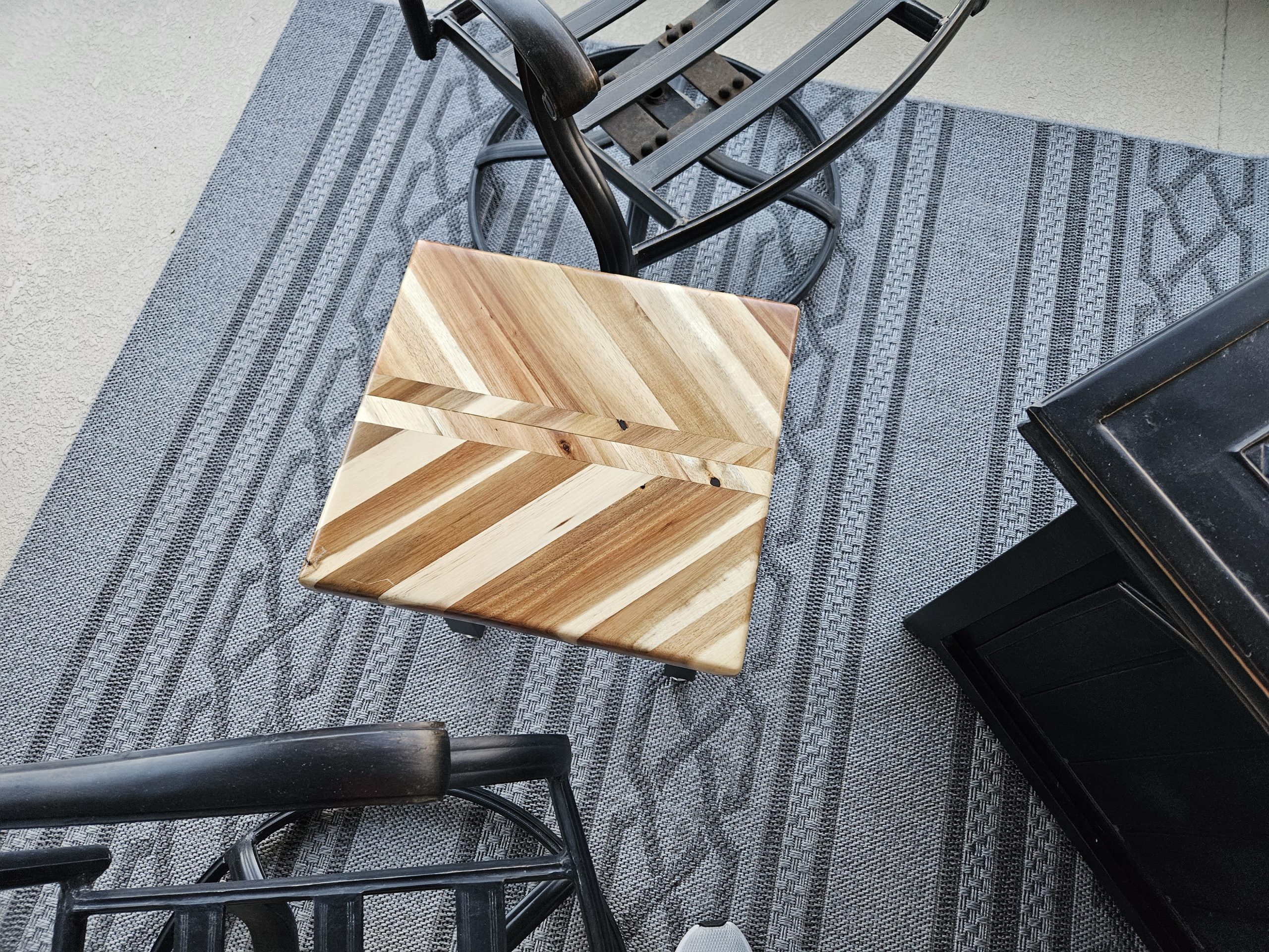 Outdoor end tables. 150.00 each butcher block with metal legs.